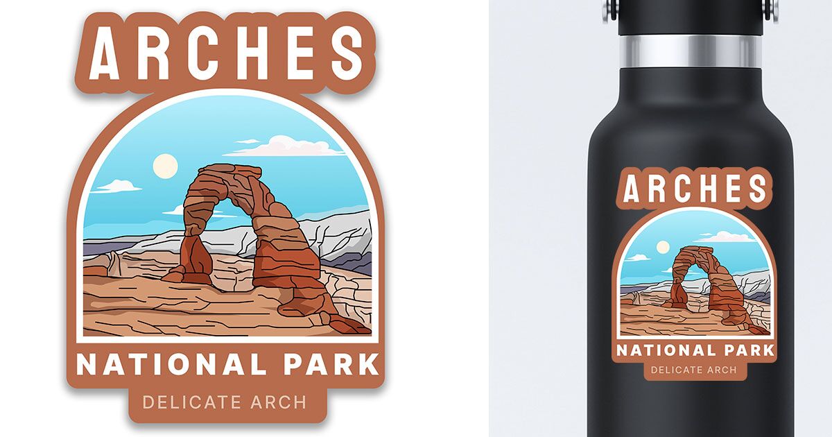 This Arches National Park sticker features Delicate Arch. Delicate Arch is one of the classic destination hikes in Arches National Park.