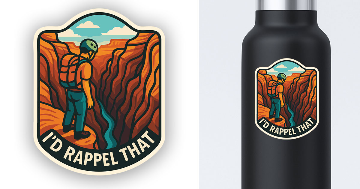 Vinyl sticker. Dishwasher safe. Great for laptops, water bottles, iPads, and any smooth solid flat surface. I’d rappel that Canyoneering sticker.