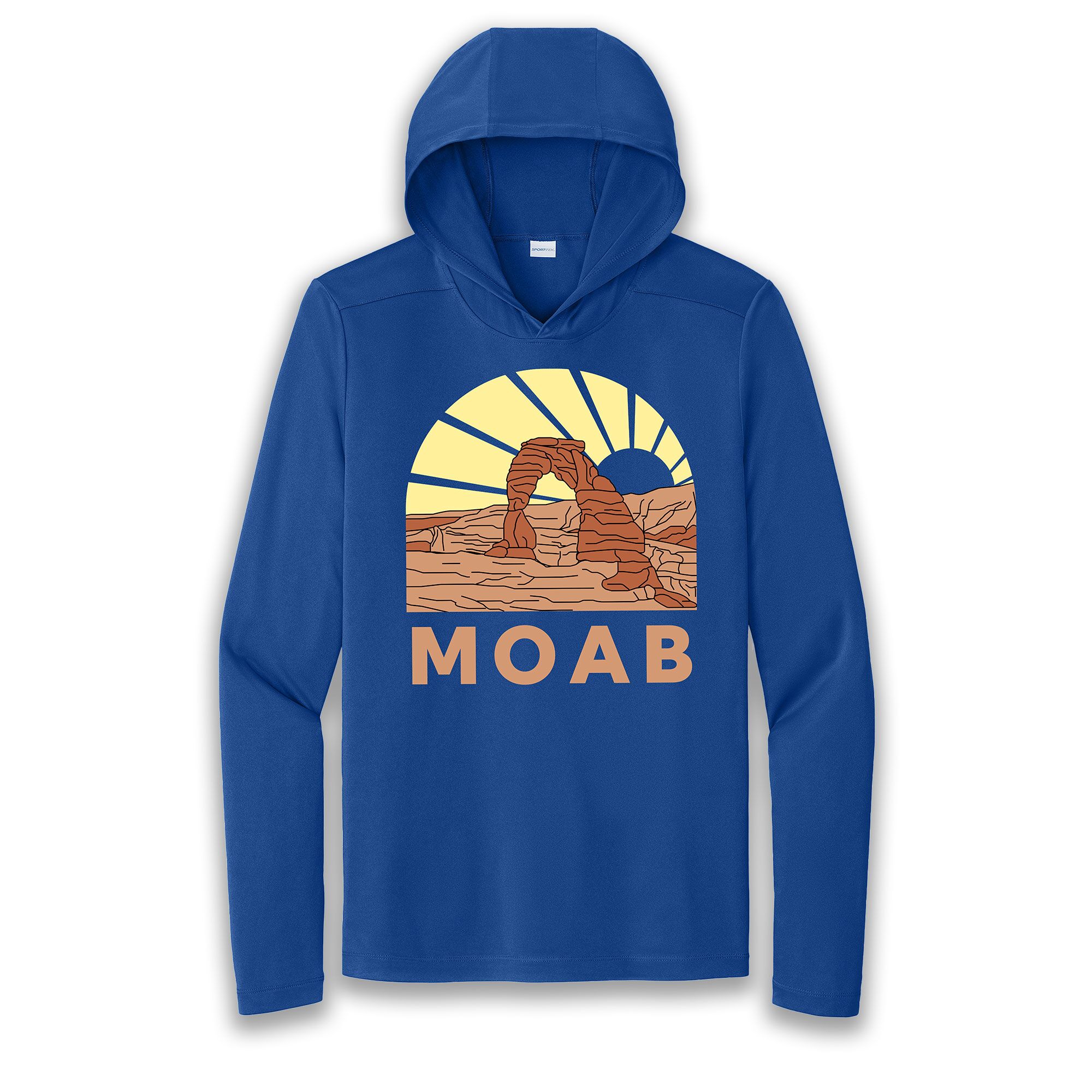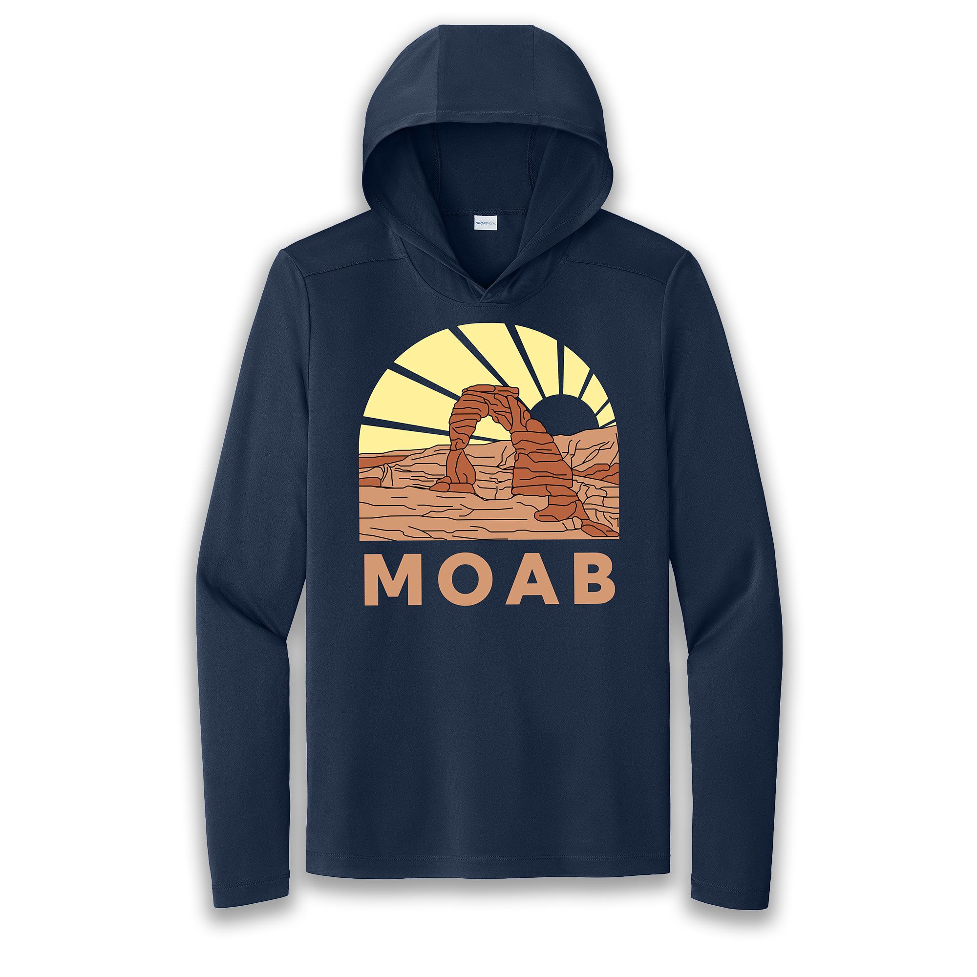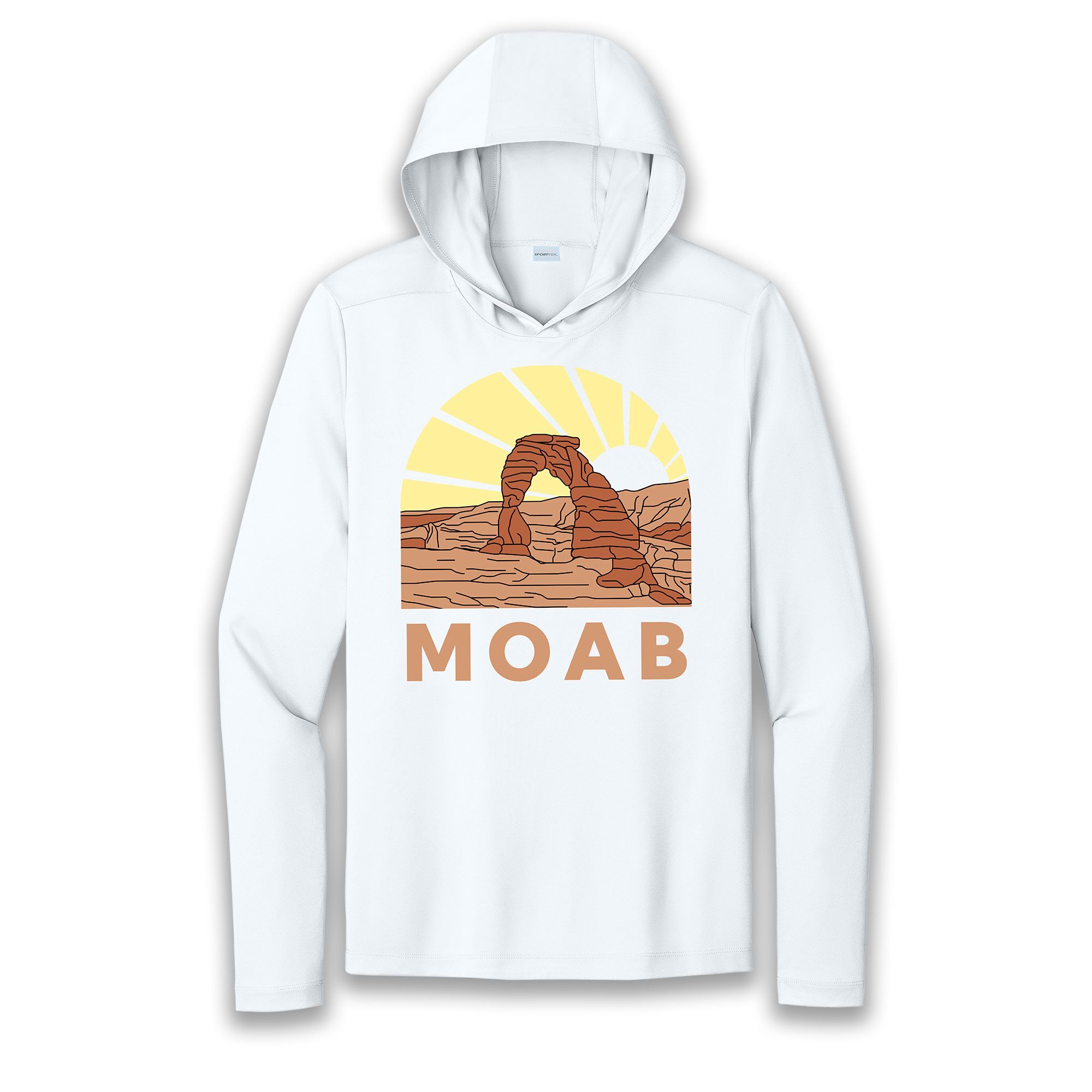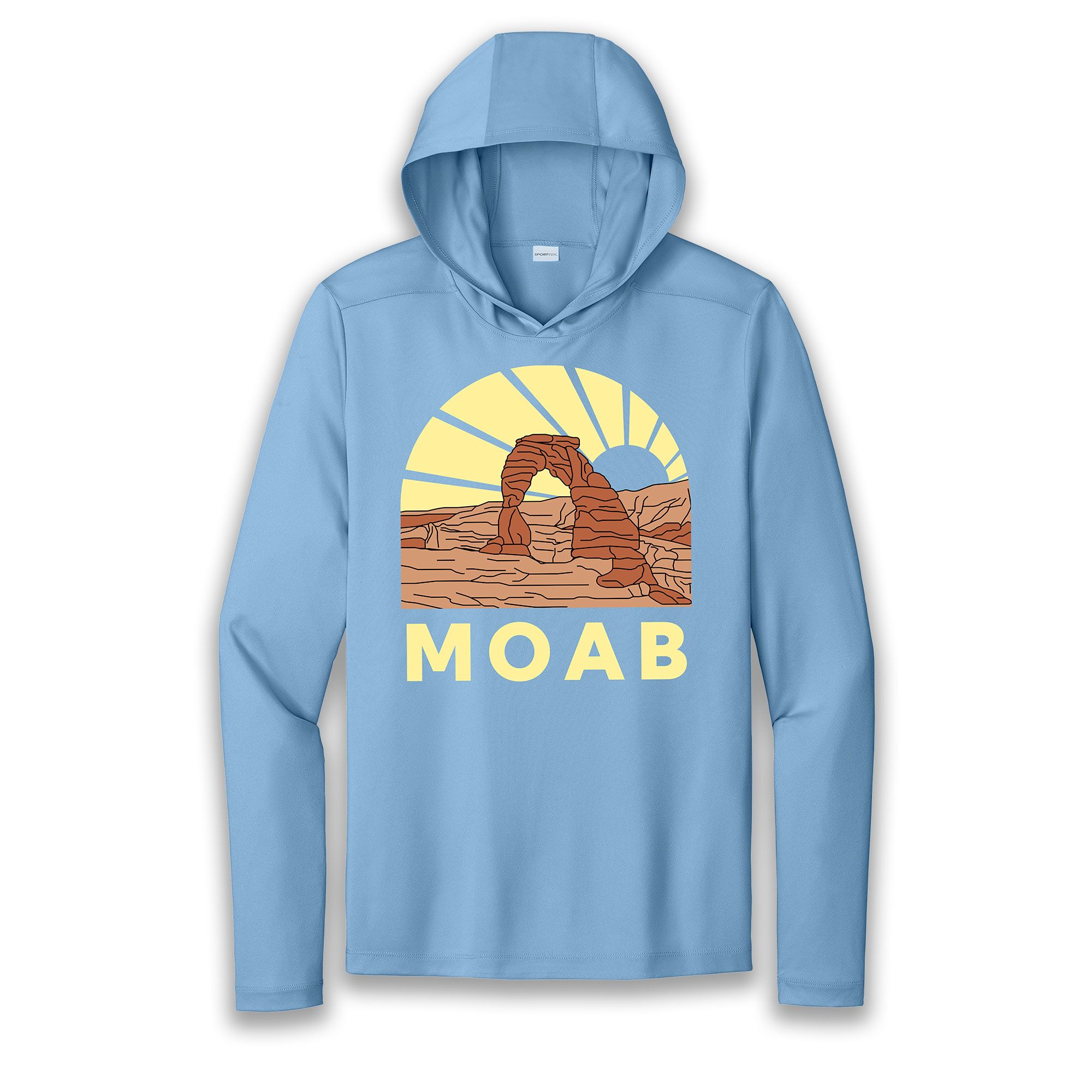 Moab Sun Hoodie featuring Delicate Arch in Arches National Park. This sun hoodie offers 50 UPF protection. It is lightweight and very soft. 100% polyester.