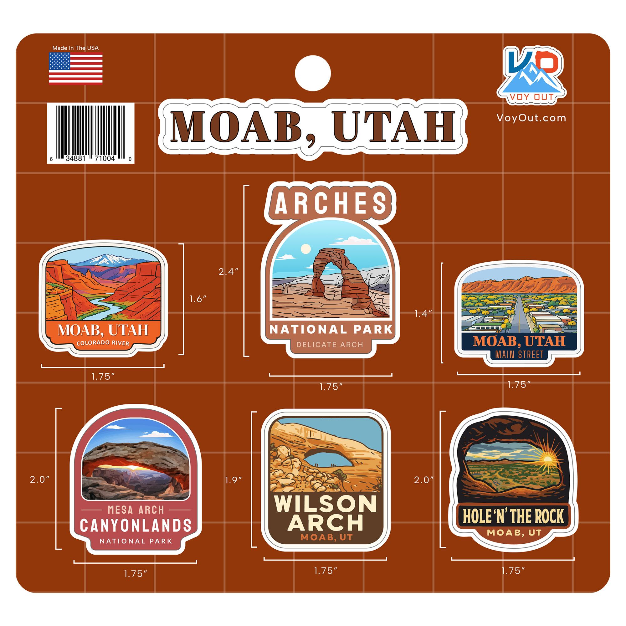 This Moab sticker sheet features 7 different stickers which feature the city of Moab and surrounding popular tourist attractions