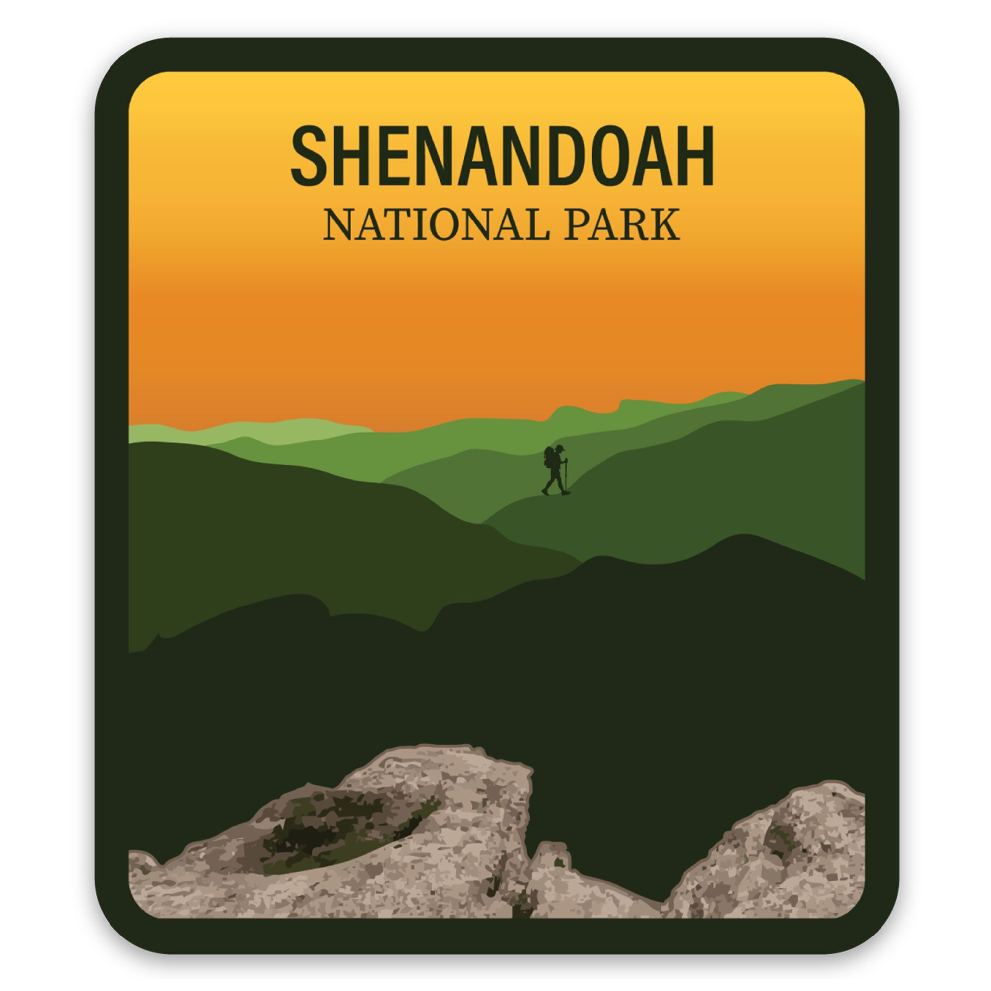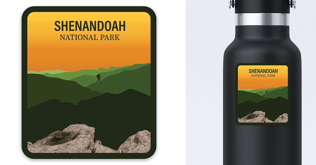 This Shenandoah National Park Sticker features a simplified view of the overlook of the park from the top of the Robertson Trail. Vinyl sticker.