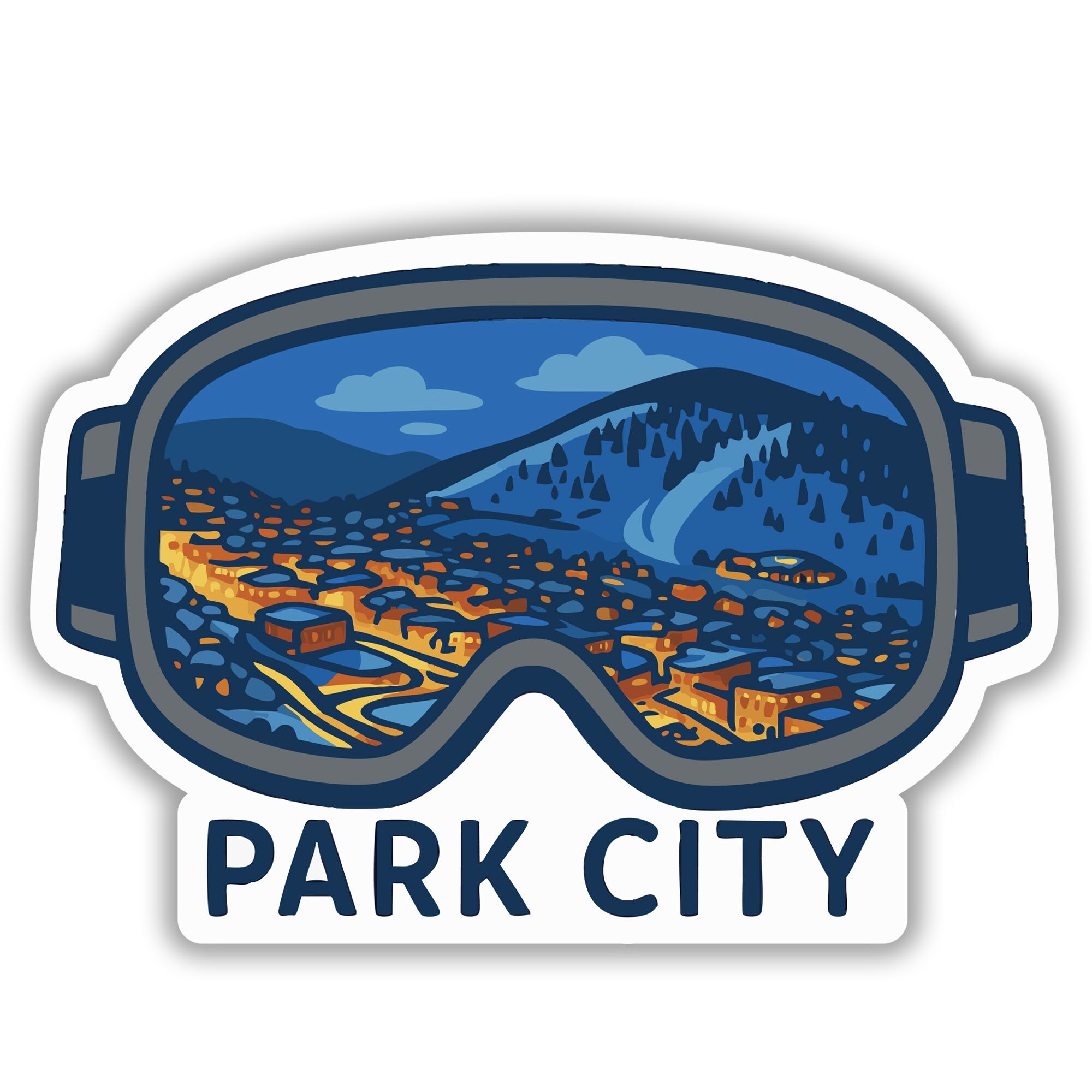 This Park City Ski Goggles sticker features the ski slopes and city of Park city at night.