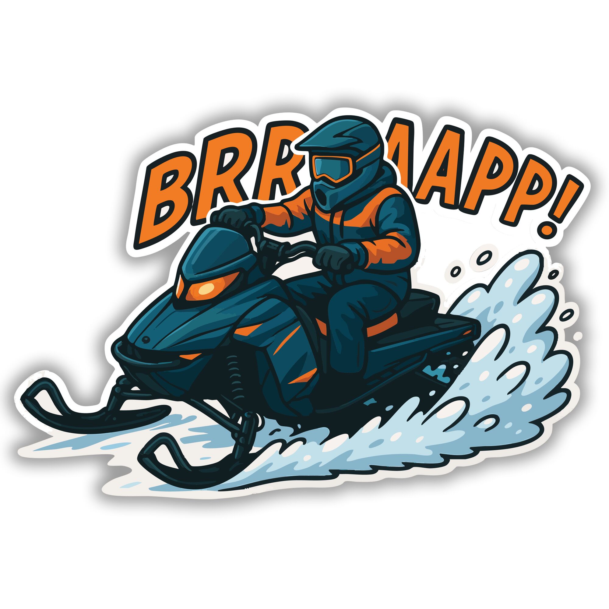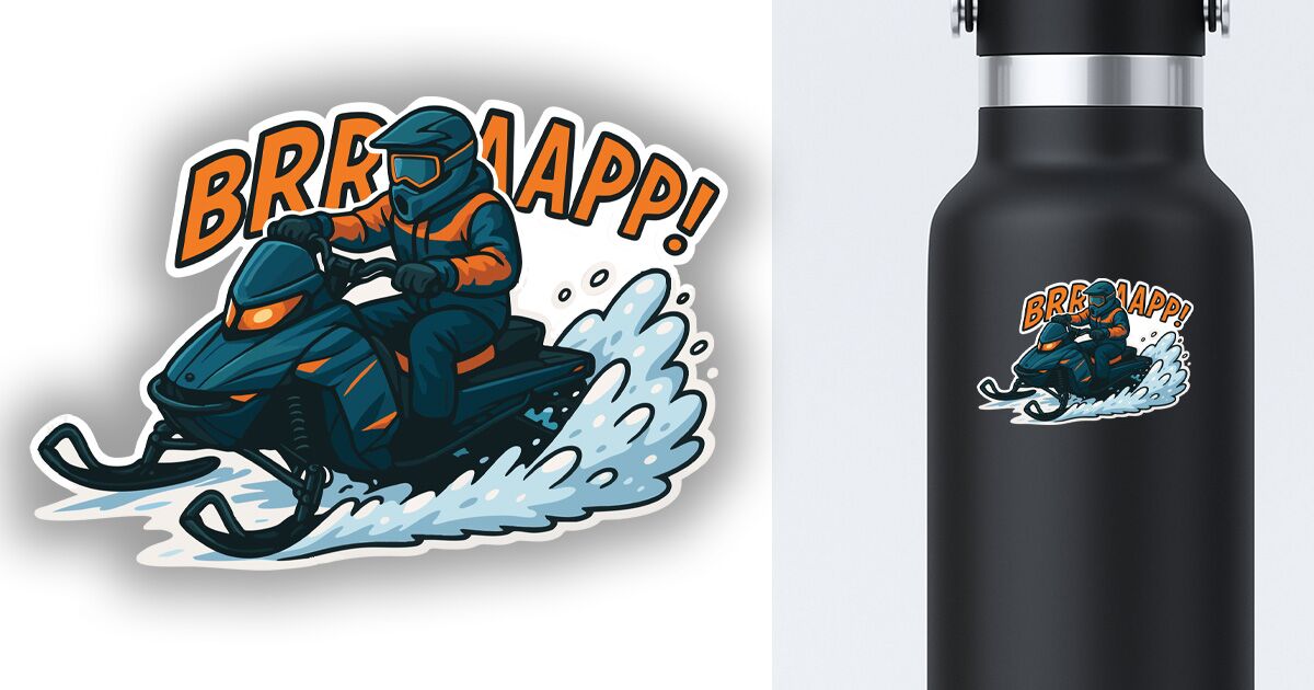 Color vinyl sticker of a man on a snowmobile with a sound effect. Resistant to water and UV damage. Great for outdoor equipment, personal gear, etc.